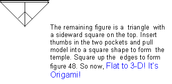 Fold up the triangular flaps to look like figure 43. Fold the flap back down. The figure should look like figure 44.